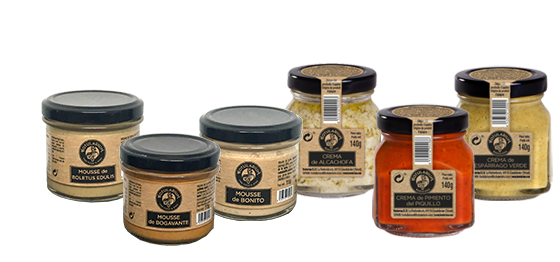 Disponemos de Mousse de Boletus Edulis, Mousse de Bogavante, Mousse de Bonito, Crema de Alcachofa, Crema de Pimiento del Piquillo y Crema de Espárrago Verde.